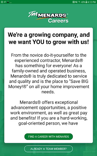 The Menards® Careers app is available for you to view job opportunities to start your new career with Menards®