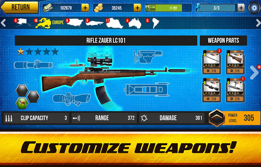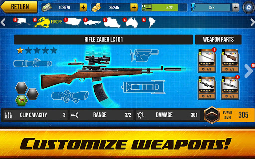 Travel to realistic hunting locations across all continents and hunt real animals that naturally inhibit those territories. Hunt a deer, a fox or a bear in Yellowstone Park (USA), pursue a rhinoceros in the Nile (Egypt), entrap a walrus in the Arctic Ocean (Russia), target a dingo in the Australian Outback and much more! Go hunting to the most exotic spots, right from your mobile device. Deer shooting games just went global!