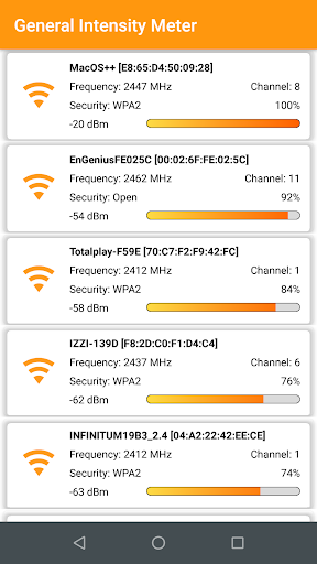 Obtain the signal strength of the WiFi network to which you are connected and the WiFi networks that surround it. This is useful so you can find good areas to connect to WiFi networks. In addition to the signal strength of the WiFi network, other relevant features can be observed, such as the MAC address, the WiFi network security, BSSID, etc.