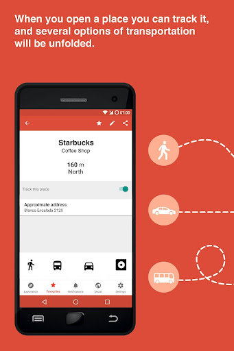- Exploration: Provides your actual position, nearby places, and street intersections while you are walking on the street, in a bus or by car.